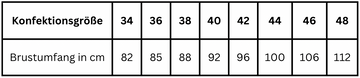 Die Wahl der Konfektionsgröße richtet sich nach dem Brustumfang. Falls du zwischen zwei Größen liegst, wähle die Größere, z.B. bei einem Brustumfang von 93 cm, wähle die Größe 42.