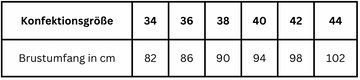 Die Wahl der Konfektionsgröße richtet sich nach dem Brustumfang. Falls du zwischen zwei Größen liegst, wähle die Größere. Wähle beispielsweise die Größe 40 bei einem Brustumfang von 91 cm.